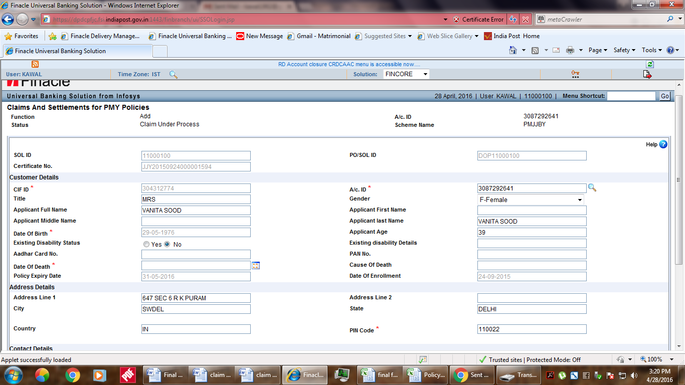 - Post Office to verify the Claim Form & the nominee details from the relevant Finacle menu through which enrolment was made and to fill in the relevant columns of the Claim form.