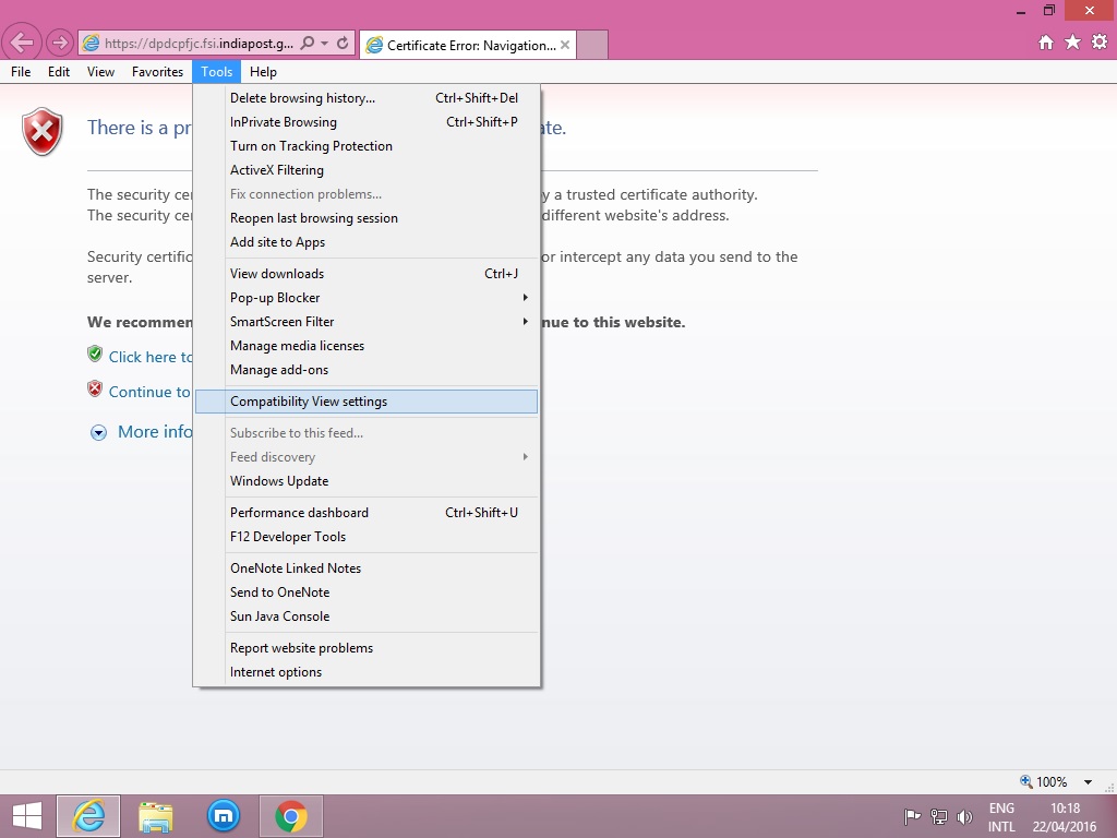 1. To solve this go to compatibility settings under tools in Internet Explorer and add the site indiapost.gov.in as shown in screenshot. This solves the above said problem.